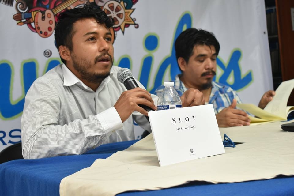 El escritor acapulqueño Ari J. González (Premio Nacional de Poesía Germán List Arzubide, 2017), presentó su libro titulado “slot” en los Viernes Culturales de la biblioteca de la Universidad Hipócrates, ante alumnos de la licenciatura de Médico Cirujano quienes mostraron gran interés en la temática abordada, ya que busca generar una propuesta de lectura basada en la noción del azar combinatorio de las máquinas tragamonedas y la forma en la cual se ensamblan diferentes poemas. La presentación del libro fue realizada por el escritor y promotor de la lectura José Antonio Salinas Bautista (Premio Nacional de Poesía Efraín Huerta, 2016).