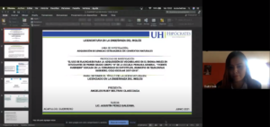 Con la finalidad de obtener el título de Licenciada en la Enseñanza del Inglés, la egresada Dulce Brigite Beltrán Olascoaga, realizó el acto virtual de examen profesional a través de la sustentación del trabajo de investigación, en modalidad tesis con el tema: “Las canciones como estrategia didáctica para la adquisición de vocabulario inglés”.