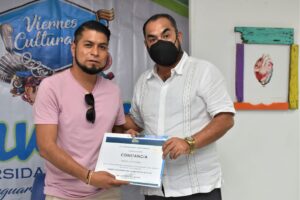 Al término del conversatorio, se desarrolló una sesión de preguntas y respuestas por parte del público. Posteriormente, el Mtro. Juan Ramón Nieto Quezada, Vicerrector Académico de nuestra casa de estudios, agradeció la presencia del joven artista plástico y realizó la entrega del reconocimiento de participación a Mitchel Lucas.