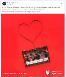 Posteriormente, la estación de radio universitaria “Radio Hipócrates”, transmitió un programa musical especial, el cual estuvo conducido por Valeria Aylin Hernández Muñoz, estudiante del cuarto semestre de la Licenciatura en Ciencias de la Comunicación y Publicidad. Además, para hacer este día más especial se compartió una playlist, la cual se albergó en la cuenta de Spotify de Radio Hipócrates.