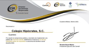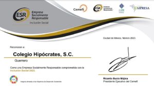 El Centro Mexicano para la Filantropía, A.C., (Cemefi) y la Alianza por la Responsabilidad Social Empresarial en México (AliaRSE), reconoce a la Universidad Hipócrates como una Empresa Socialmente Responsable comprometida con la Inclusión Social 2023.