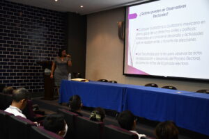 Dicha actividad se desarrolló con la finalidad de promover mediante capacitaciones la Observación Electoral, con el objetivo de motivar la participación de este derecho en la Ciudadanía. Así como hacer partícipes de las vacantes para servicios y empleos temporales para el Proceso Electoral 2023-2024.