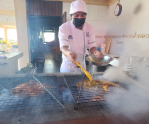 La presentación final de nuestros futuros chefs fue un rescate gastronómico de nuestro querido estado, presentando un pescado a la talla con adobo de Guinatán, un guiso tradicional de la costa grande de nuestro estado. Acompañaron este plato principal con molotes de plátano macho rellenos de queso costeño, una refrescante agua de horchata de arroz morado, con tortillas de maíz blanco y morado aromatizadas con hierbas tradicionales de nuestra región, como chípil, hierba santa y epazote. Para dar el toque final, añadieron crujientes chips de camote. Esta presentación fue, en esencia, un apasionado rescate gastronómico de nuestro querido estado.
