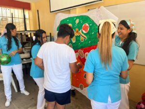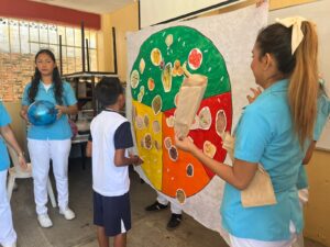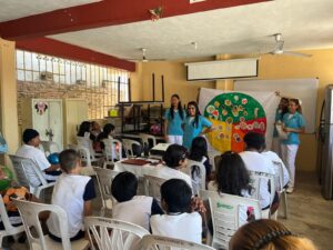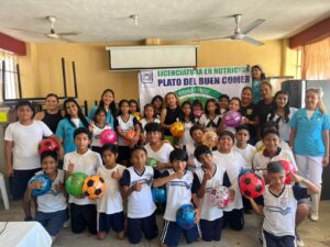 En seguimiento a las actividades del Programa de Acciones Ciudadanas, los estudiantes de la Licenciatura en Nutrición, bajo la asesoría de la Mtra. Alejandra Patricia Flores Bello, docente de la Universidad Hipócrates (UH), llevaron a cabo pláticas sobre el tema “El Plato del Bien Comer” para los alumnos de la Escuela Primaria Alfredo López Cisneros. Durante la plática, se realizaron dinámicas para reforzar los conocimientos y se entregaron pelotas como premios a las respuestas acertadas.