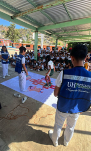 La jornada estuvo acompañada por Draco, la mascota de la Universidad Hipócrates, quien entregó pelotas y juguetes como obsequios a los estudiantes, generando un ambiente divertido, cercano y formativo.