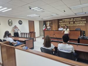 Durante la actividad, los estudiantes fueron recibidos por las juezas Mtra. Ytania Fuentes Martínez, Dra. Azucena Pineda Guillermo, Mtra. Ma. del Rosario Muñiz Quezada y por Guille Yanet Juárez Casarrubias, administradora del Juzgado, quienes compartieron con ellos su experiencia en la aplicación del sistema integral de justicia para adolescentes.