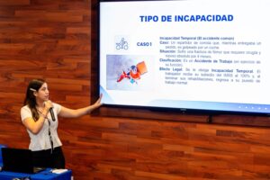 Durante la ponencia, los asistentes conocieron los diferentes tipos de incapacidades por riesgo de trabajo, su clasificación, así como su efecto legal dentro del entorno empresarial. Asimismo, se realizaron simulaciones de casos prácticos que permitieron ejemplificar situaciones reales y comprender el impacto que estas incapacidades generan en la gestión y toma de decisiones dentro de las organizaciones.
